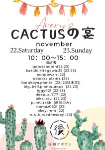 2025.11.20 イベント開催のお知らせ 11月22日・23日は弊社第2駐車場にてイベントが開催されます。 駐車場は20台ほどとなります。 満車の場合は第1駐車場をご利用ください。 また23日(日)についてはイベント開催時間10:00-15:00(12:00-13:00は休み)の間、ハウスでの小売営業は行いますが、 スタッフが少人数となるため、寄せ植え体験や柱サボテンなど大鉢の購入の対応が出来かねます。 ご迷惑をお掛けしますが、予めご了承のほど宜しくお願い致します。 < PREV 一覧へ戻る NEXT >